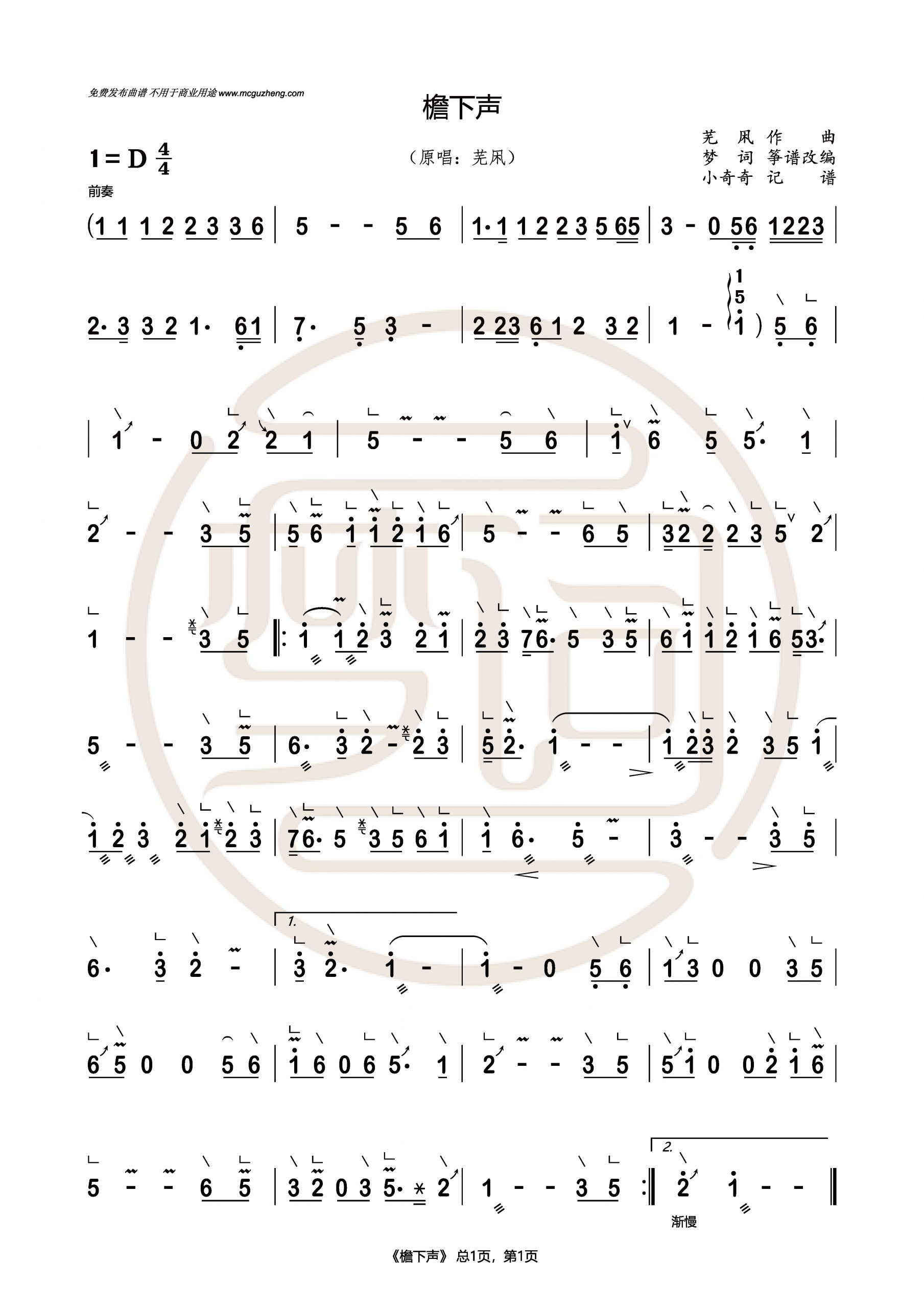 不得用于商业用途: » 《檐下声》梦词改编免费曲谱 D 调 吉他伴奏